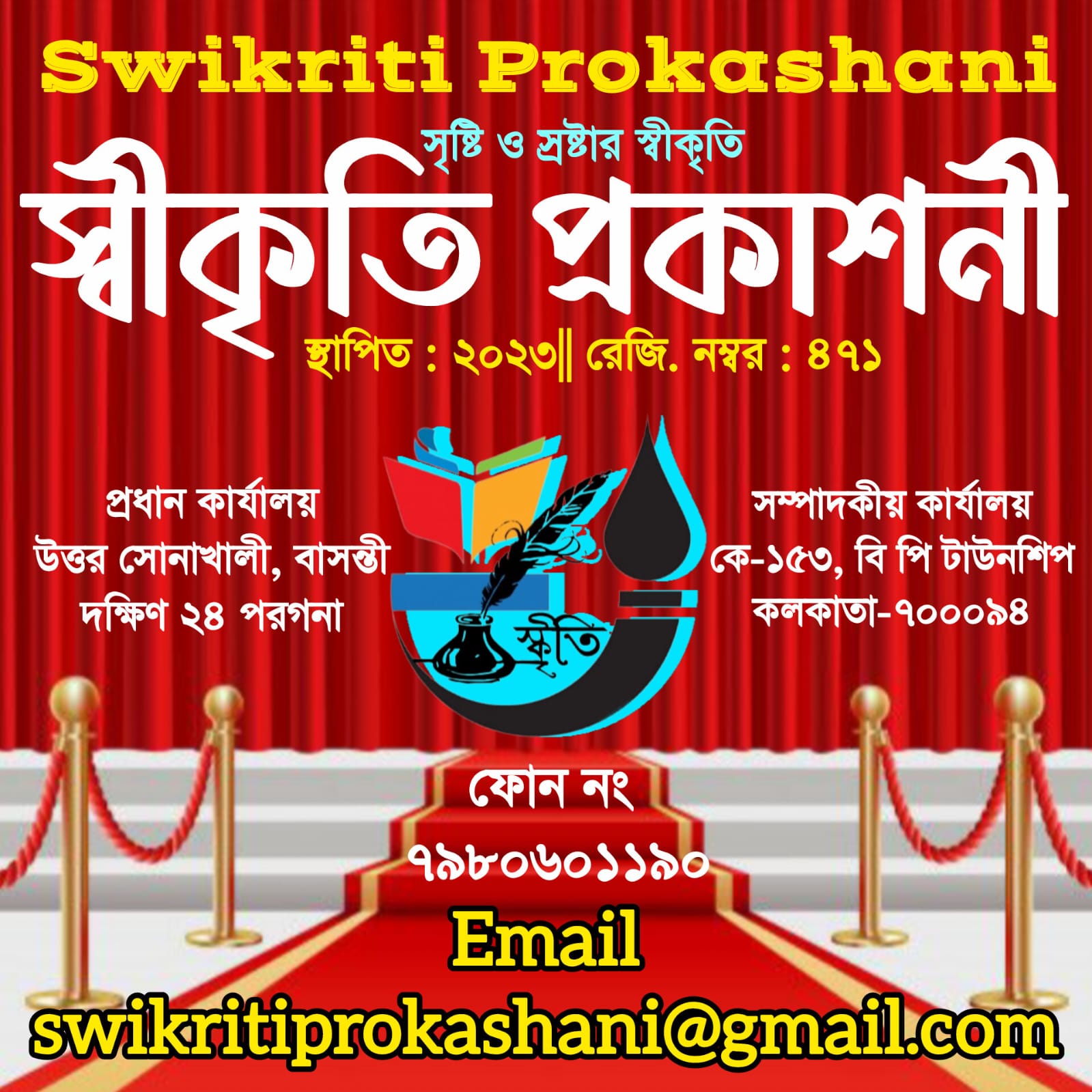 স্বীকৃতি প্রকাশনী একটি সৃজনধর্মী প্রকাশনা সংস্থা, যার মূল লক্ষ্য নতুন ও প্রতিষ্ঠিত লেখক, কবি, শিল্পীদের সাহিত্য ও সৃষ্টিশীল কাজকে স্বীকৃতি ও মর্যাদা প্রদান করা। “সৃষ্টি ও স্রষ্টার স্বীকৃতি”–এর ভাবনা অনুযায়ী এই সংস্থা সাহিত্য, সংস্কৃতি ও চিন্তার জগতে নবীন প্রতিভাদের উন্মোচন এবং তাদের সৃষ্টিকে পাঠকের কাছে পৌঁছে দেওয়ার কাজে নিবেদিত। সংস্থার উদ্দেশ্য হলো—বাংলা ভাষা, সাহিত্য ও সংস্কৃতির বিকাশে অবদান রাখা এবং সৃষ্টিশীলতার ধারাকে সমাজে ছড়িয়ে দেওয়া। স্বীকৃতি প্রকাশনীর দ্বারা প্রকাশিত গ্রন্থের তালিকা পেতে নিচের লিঙ্কে ক্লিক করুন অথবা উপরের সার্চ বক্সে গিয়ে সার্চ করুন।
